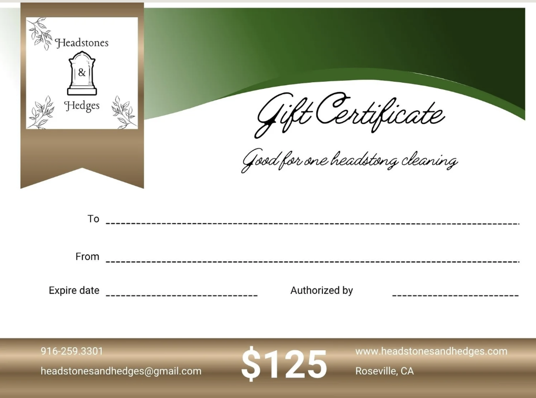 Purchase a gift certificate for headstone cleaning. Purchase here, and we can mail a physical gift certificate to include in a sympathy card. Please note our service areas.